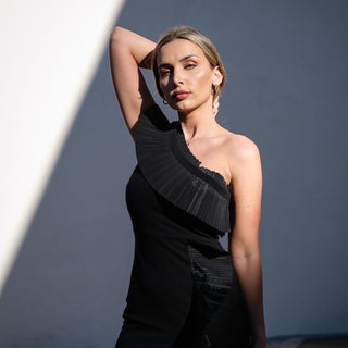 Slimming Fit with Unique Design: Adorn yourself in a body-sculpting hourglass silhouette accentuated by the cascading pleated taffeta ruffle, amplifying your confidence and glamorous appeal.